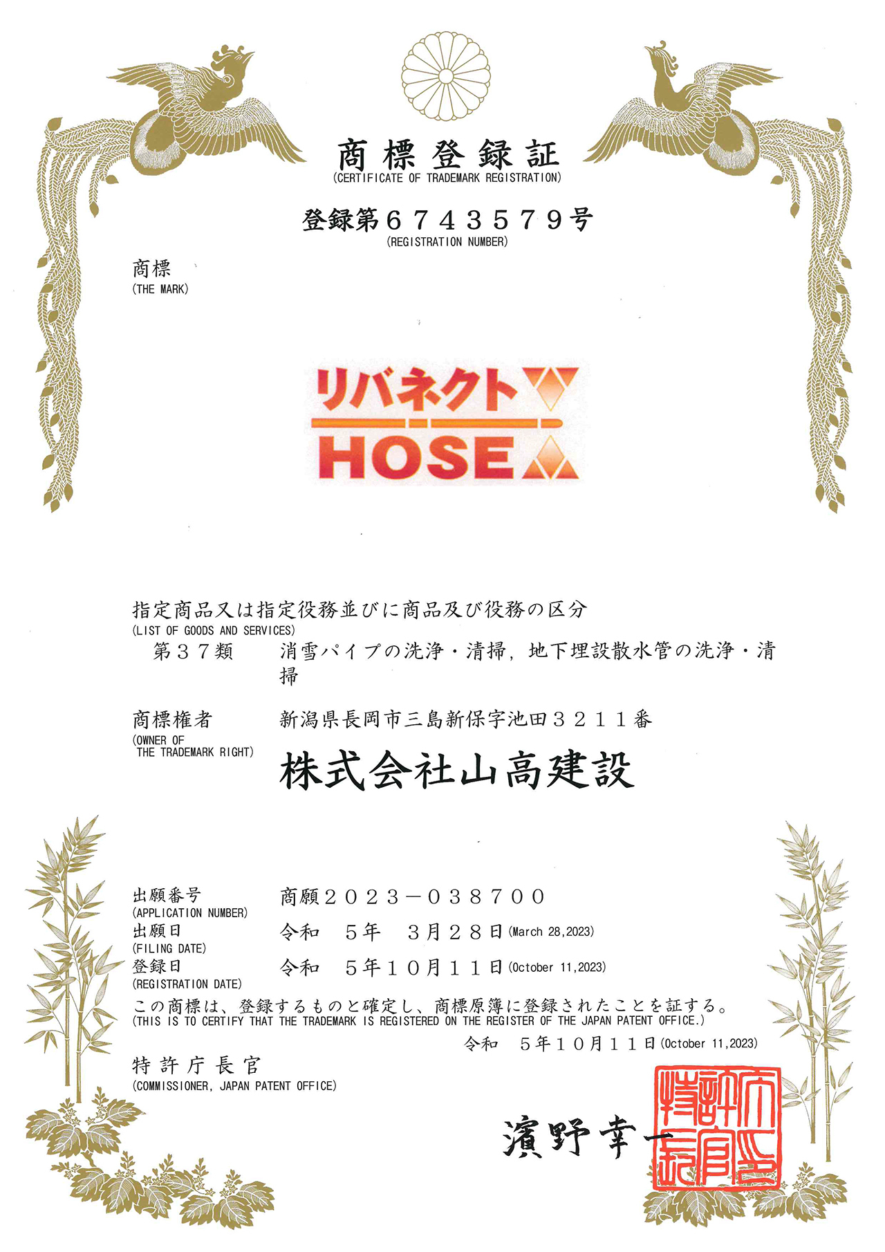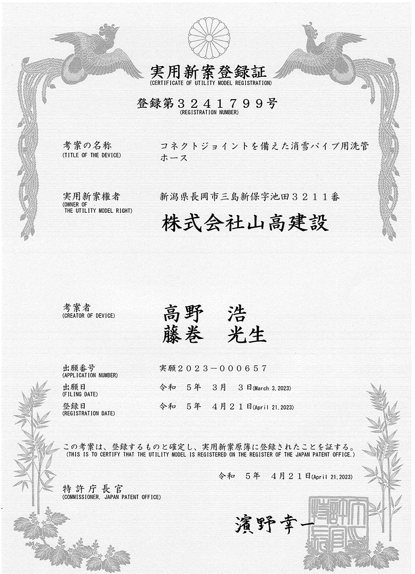 リバーサルクリーニングの新技術「消雪パイプ立管用洗浄装置」が実用新案登録されました(登録第3253809号)。より効率的・効果的に消雪パイプのメンテナンスを可能にする技術になります。開発・登録にご協力いただきました関係各所の皆様、大変ありがとうございました。今後の動画などでさらに詳しく紹介させていただきます、どうぞよろしくお願いします。
