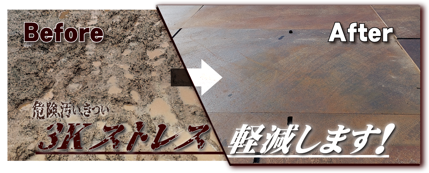 「安全な作業の第一歩は足元から。」と言われますが、皆様の現場はいかがでしょうか?土がむき出しの現場は作業員さんや重機の足元の汚れや、傾き、最悪転倒の危険もはらみ、思わぬ大損害に繋がりかねません。安心安全な鉄板養生で3K(危険・汚い・きつい)の軽減!また、作業の効率化・高品質化を図りましょう!!