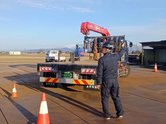様々な現場を想定し、日々の研鑽と実戦経験を積んだベテランスタッフが㈱山高建設の最大の強みです。写真は乗り入れシミュレーション訓練の様子です。