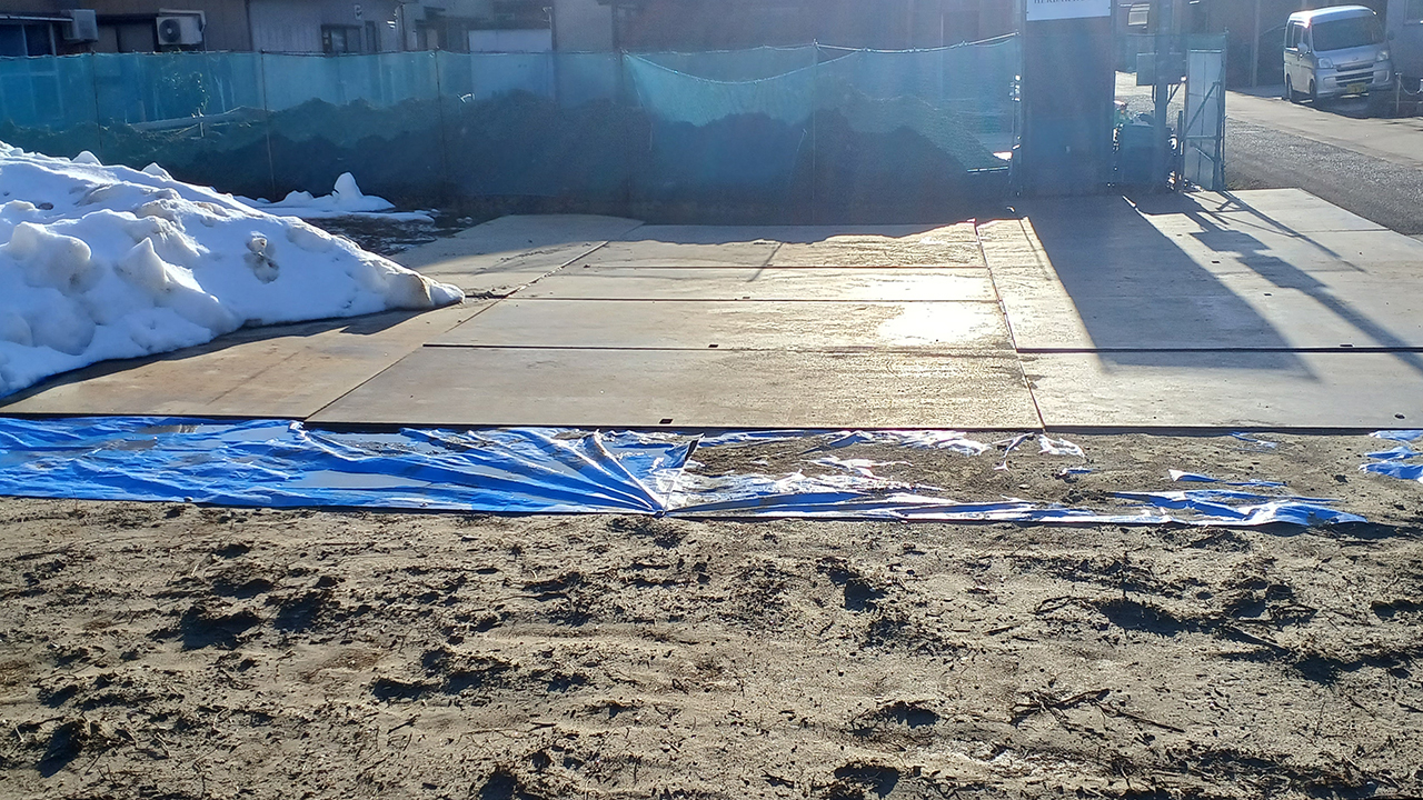 上の写真は最近ご要望の多いブルーシート※の上に鉄板を敷いた様子です。泥汚れがより少なく、作業員さんも車両や足元の洗浄にかかる手間と時間が省けるため、とても好評です。現場に合った敷設を心掛けておりますので、これ以外にもご要望等ございましたら、お気軽にお申し付けください。